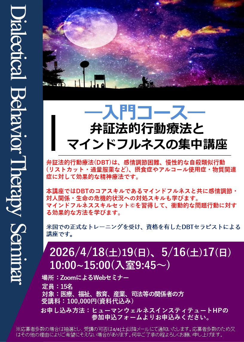 【応用コース】『弁証法的行動療法とマインドフルネスの集中講座』を2025年3月15日&16日に開催させていただきます。本講座では、困難事例への対処・介入技法やスキルのブラッシュアップを行います。#弁証法的行動療法 #DBT #マインドフルネス #ワイズマインド #情動調節 #変化と受容スキル #承認技法 pic.twitter.com/lSexe1gVVz