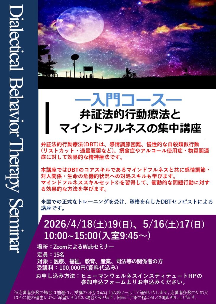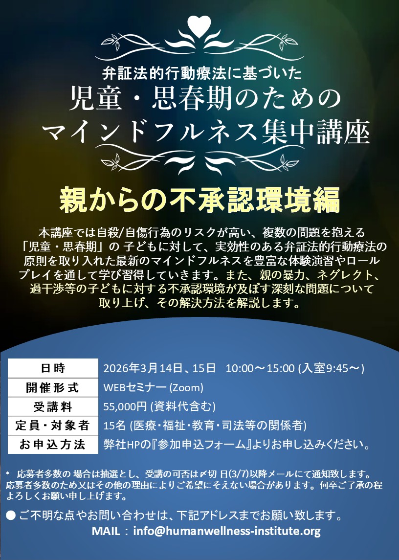 【応用コース】『弁証法的行動療法とマインドフルネスの集中講座』を2025年3月15日&16日に開催させていただきます。本講座では、困難事例への対処・介入技法やスキルのブラッシュアップを行います。#弁証法的行動療法 #DBT #マインドフルネス #ワイズマインド #情動調節 #変化と受容スキル #承認技法 pic.twitter.com/lSexe1gVVz